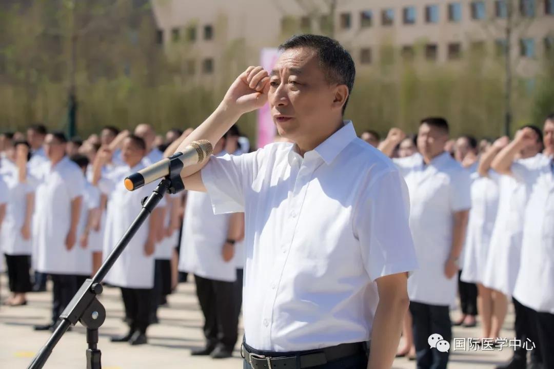 在尹強院長帶領下,全體員工莊嚴地宣誓:“我們是天的使者,以救死扶傷為天職。珍惜每一次服務,一次做好。只為有益患者之事,絕不為金錢泯滅良心。匯聚人類生命科學智慧,同步國際頂尖診療水平……”每一位員工舉起右拳,握緊責任與使命,鏗鏘有力的誓言表達了醫(yī)護人員獻身醫(yī)學的信念,堅定了每一個員工爭做西安國際醫(yī)學中心人的決心與信心。