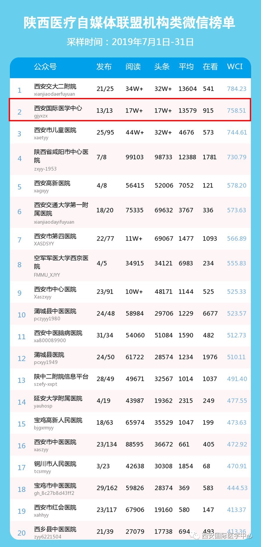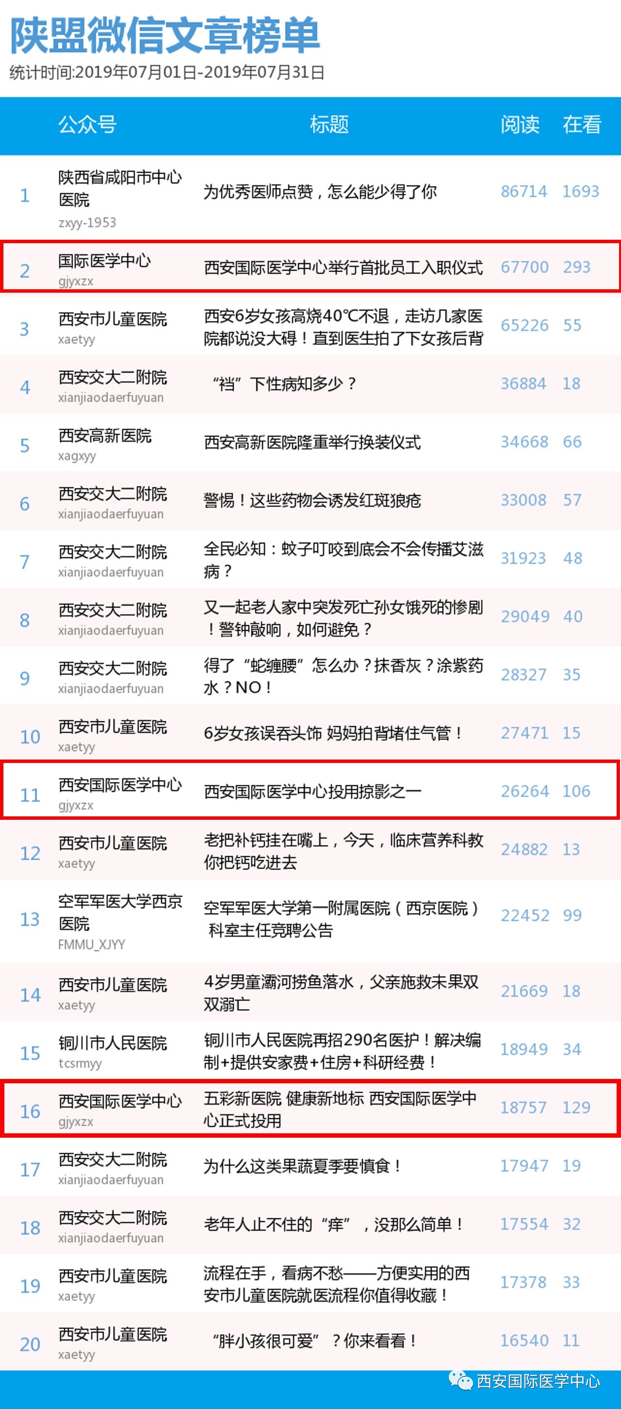 8月2日,中國(guó)醫(yī)療自媒體聯(lián)盟陜西分盟醫(yī)療機(jī)構(gòu)類微信公眾號(hào)7月份排行榜發(fā)布,西安國(guó)際醫(yī)學(xué)中心微信公眾號(hào)奪得醫(yī)療機(jī)構(gòu)類榜單第2名,高居“榜眼”。在陜西醫(yī)療自媒體聯(lián)盟的推薦下,西安國(guó)際醫(yī)學(xué)中心順利進(jìn)入今日頭條號(hào)(醫(yī)療機(jī)構(gòu)),微信文章將同步刊登到今日頭條。