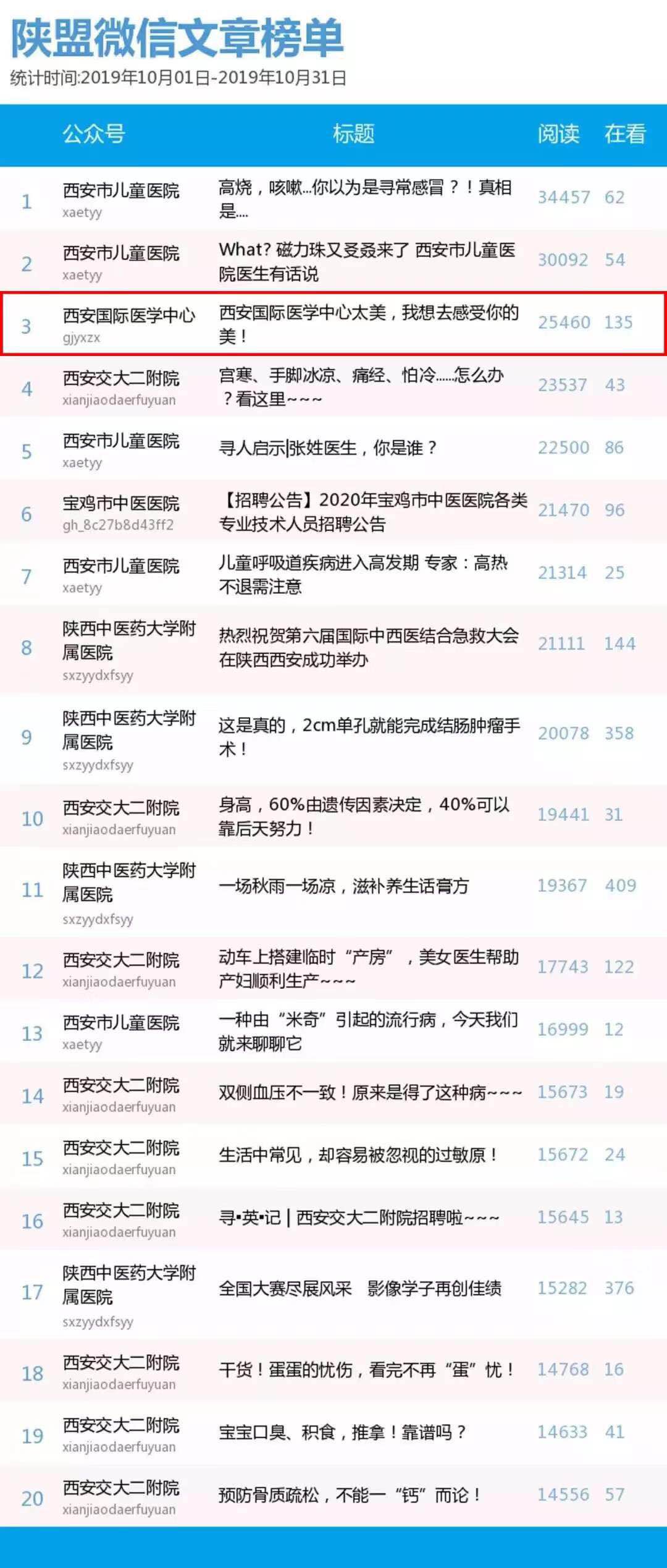 陜西醫(yī)療自媒體聯(lián)盟醫(yī)療機(jī)構(gòu)類(lèi)微信公眾號(hào)2019年10月微信文章榜單第三名——《西安國(guó)際醫(yī)學(xué)中心太美,我想去感受你的美》。文章從醫(yī)院優(yōu)美的環(huán)境角度切入,詳細(xì)介紹了西安國(guó)際醫(yī)學(xué)中心的地理位置、建筑特色、就醫(yī)環(huán)境、名醫(yī)專(zhuān)家、醫(yī)療惠民等,最終獲得25460的閱讀量,位列第三。