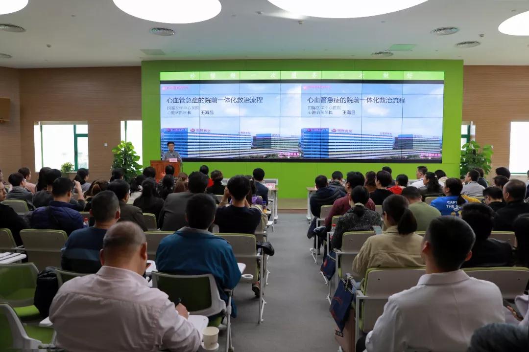 講座環(huán)節(jié),王海昌院長就《心血管急癥的院前院內(nèi)一體化救治》進(jìn)行了詳細(xì)闡述,以大量數(shù)據(jù)強(qiáng)調(diào)了心血管疾病救治過程中把握時(shí)間窗的重要性,建議根據(jù)急性冠脈綜合征突發(fā)性、不可預(yù)測的特點(diǎn),建立完善的院前、院內(nèi)急救網(wǎng)絡(luò)、胸痛中心,協(xié)助120高速有效的運(yùn)轉(zhuǎn);潘僑主任為大家介紹了心梗伴室顫猝死的院前院內(nèi)救治,分析搶救成功的心肌梗死案例,講解了發(fā)生心跳驟停患者中80-95%為心源性,心源性休克首選冠脈介入診療,院前及院內(nèi)急救早期、快速并完全地開通梗死相關(guān)動(dòng)脈是改善患者預(yù)后的關(guān)鍵。