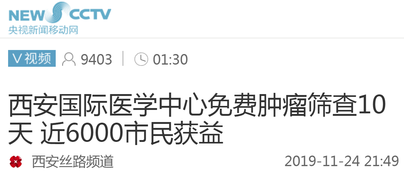 央視新聞移動(dòng)網(wǎng)報(bào)道—西安國際醫(yī)學(xué)中心免費(fèi)腫瘤篩查10天 近6000市民獲益。點(diǎn)擊閱讀。