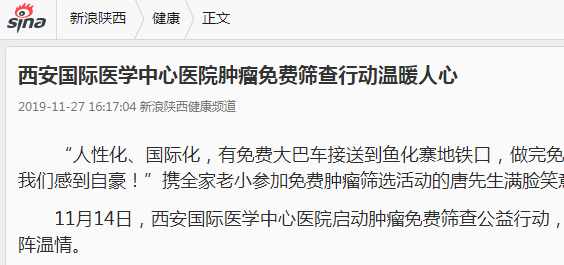 新浪網(wǎng)報道—西安國際醫(yī)學中心醫(yī)院腫瘤免費篩查行動溫暖人心。點擊閱讀。