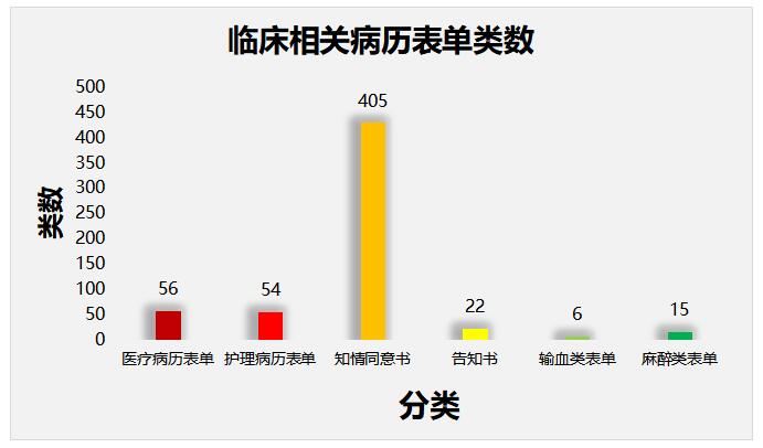 根據(jù)JCI第六版評審標(biāo)準(zhǔn),完成JCI相關(guān)醫(yī)療病歷表單類56類,JCI相關(guān)護(hù)理病歷表單54類、知情同意書405類、告知書22類、輸血類表單6類、麻醉類表單15類,總計583類。如圖所示: