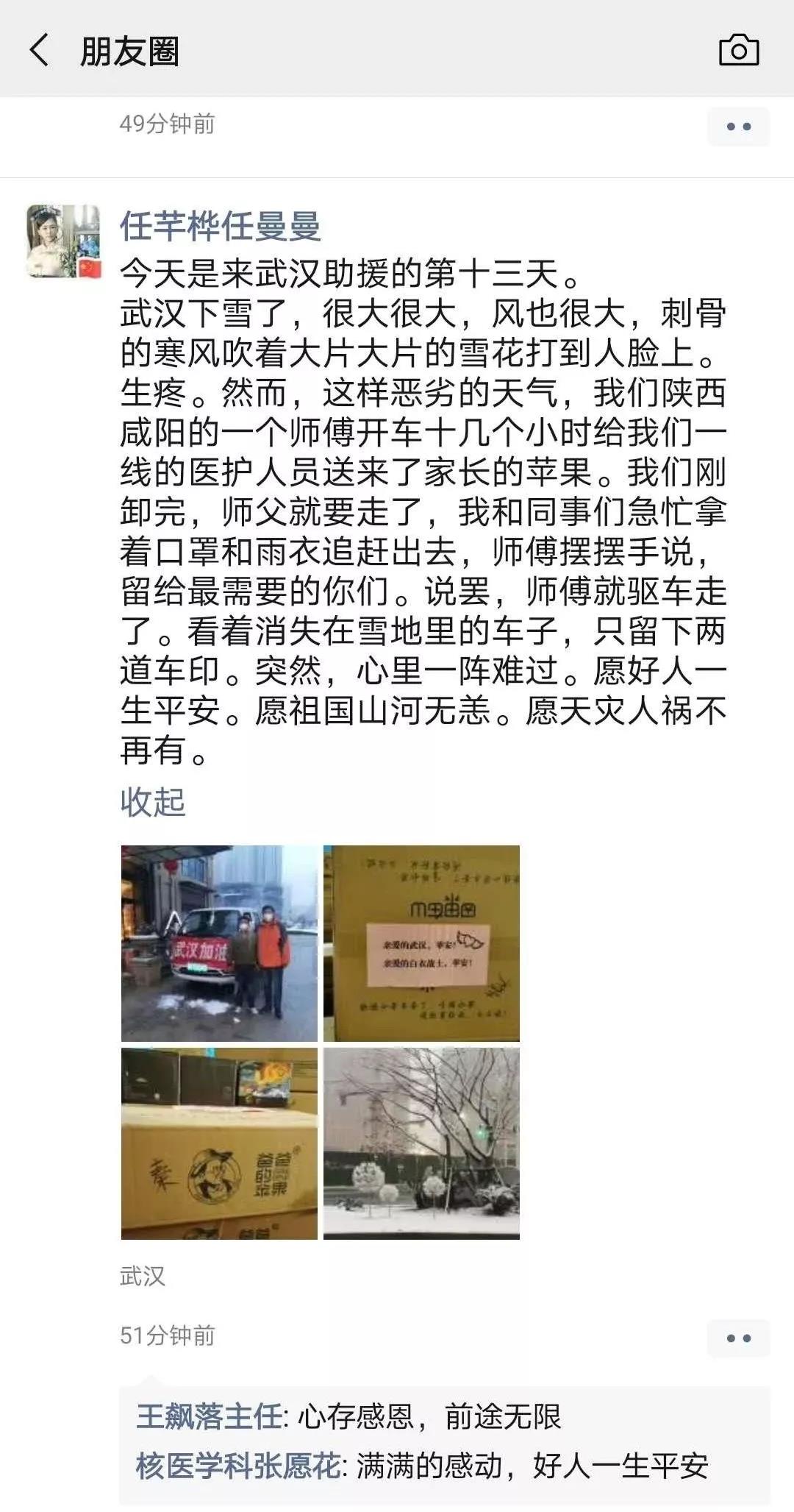 任曼曼久久不能平靜,在朋友圈里寫到:今天是來武漢援助的第十三天。武漢下雪了,很大很大,風(fēng)也很大,刺骨的寒風(fēng)吹著大片大片的雪花打到人臉上,生疼。然而,這樣惡劣的天氣,我們陜西咸陽的一個師傅開車十幾小時給我們一線的醫(yī)護人員送來了家鄉(xiāng)的蘋果。我們剛卸完,師傅就要走了,我和同事們急忙拿著口罩和雨衣追趕出去,師傅擺擺手說給最需要的你們。說罷,師傅就驅(qū)車走了。看著消失在雪地里的車子,只留下兩道車印。突然,心里一陣難過。愿好人一生平安,愿祖國山河無恙,愿天災(zāi)人禍不再有!