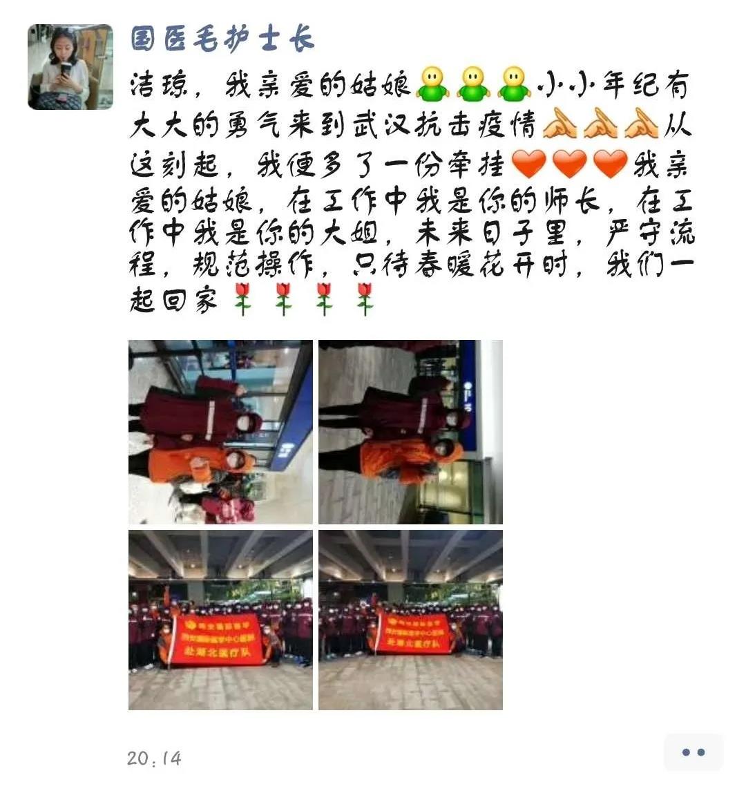 “潔瓊,我親愛的姑娘,小小年紀(jì)有大大的勇氣來到武漢,抗擊疫情,從這刻起,我便多了一份牽掛,我親愛的姑娘,在工作中我是你的師長,在生活中我是你的大姐姐,未來日子里,嚴(yán)守流程,規(guī)范操作,只待春暖花開時,我們一起回家。”這些話中充滿了護士長對潔瓊的鼓勵、疼惜、牽掛以及對抗擊疫情必勝的信心,我親愛的戰(zhàn)士們,加油,我們與你同在。