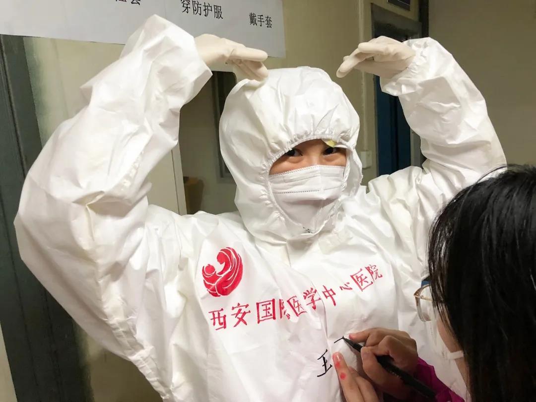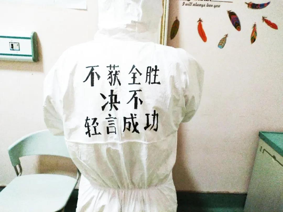 西安國際醫(yī)學(xué)中心醫(yī)院援鄂醫(yī)療隊(duì)醫(yī)護(hù)隊(duì)員都有一身特別的白袍,手繪版防護(hù)服上有國際醫(yī)學(xué)的logo。“不獲全勝絕不輕言成功”、“武漢加油”的娟秀字跡提升士氣,醫(yī)護(hù)人員擊敗新冠病毒的漫畫也鼓舞人心。