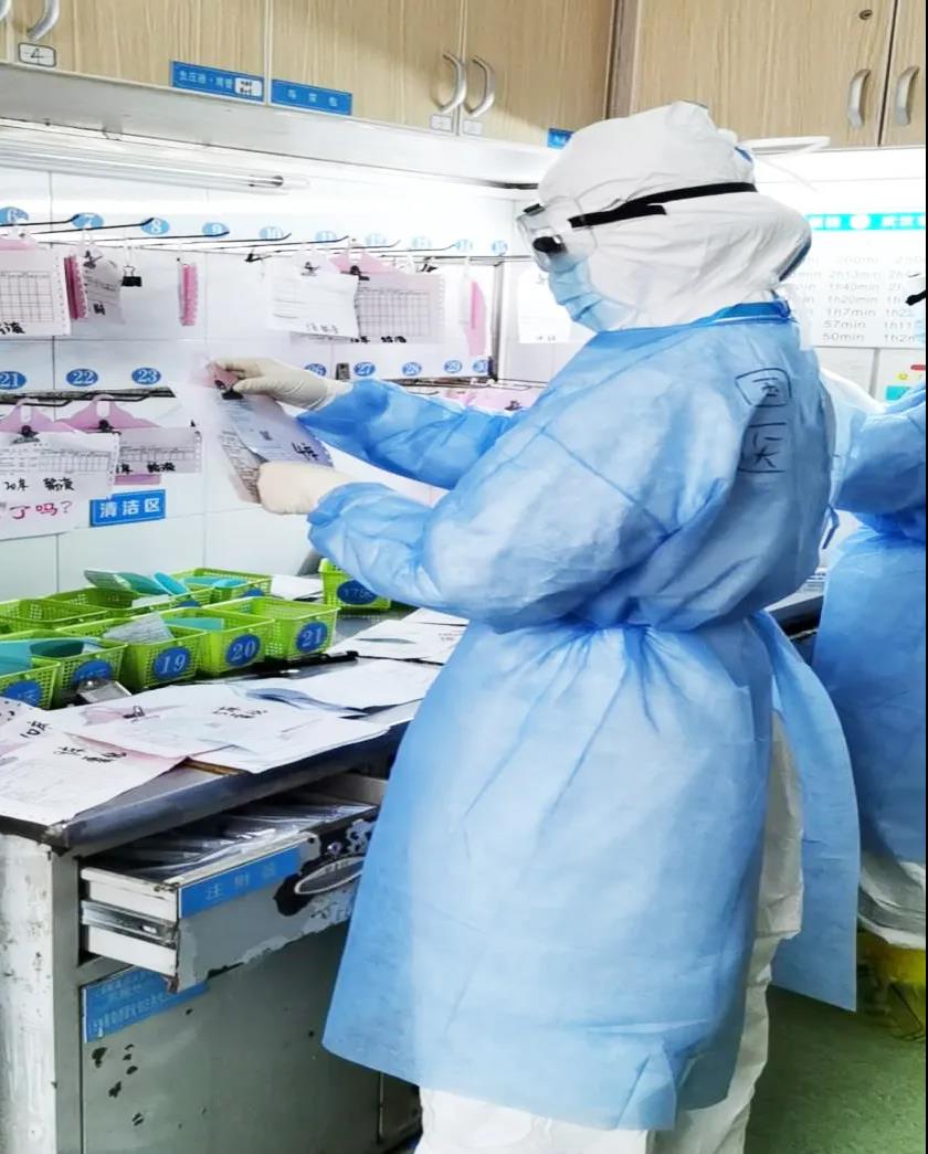 一線臨床的治療和護(hù)理工作,是真正考驗(yàn)技術(shù)的環(huán)節(jié)。加藥配藥嚴(yán)格無菌操作、雙人核對(duì)。戴著多層防護(hù)手套工作,一雙“大手”小心翼翼拿取每一小支安瓿抽吸藥液時(shí)稍顯笨拙,但是護(hù)士說:“現(xiàn)在加藥的姿勢(shì)可能有點(diǎn)狼狽,但是我沒有浪費(fèi)一滴藥,這都是在科室練出來的基本功。”