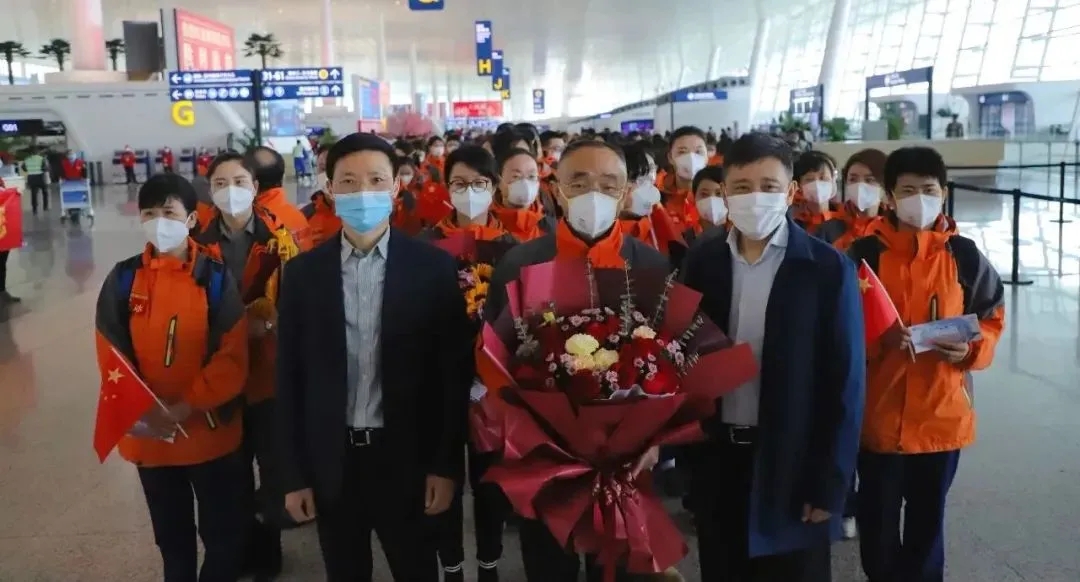 在熱烈的掌聲中,援漢醫(yī)療隊(duì)隊(duì)員們手捧鮮花,在武漢市民的感激聲中,登上機(jī)場(chǎng)大巴,啟程返回西安。