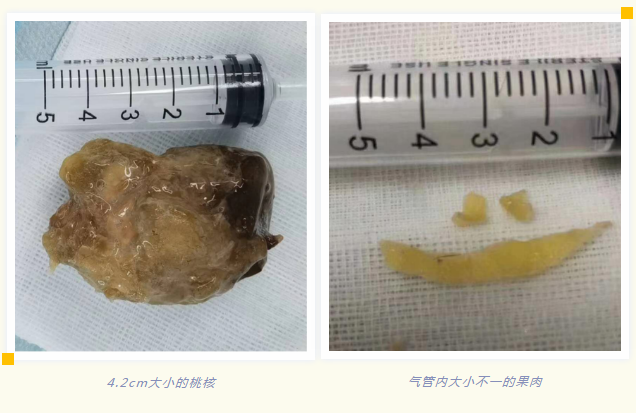 入院到治療結束,不到兩小時就取出4.2cm大小的桃核以及氣管內大小不一的果肉。