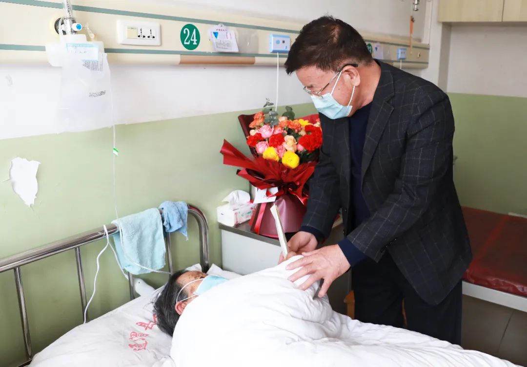 你在前方打仗,我在后方保障!醫(yī)院指派專人與醫(yī)療隊(duì)家屬一一對(duì)接,詳細(xì)了解前方親屬們實(shí)際困難,搭建與隊(duì)員家屬的聯(lián)系平臺(tái),第一時(shí)間了解并解決家屬們的困難。3月18日,王志峰總經(jīng)理、腫瘤醫(yī)院院長(zhǎng)南克俊教授等一行6人,驅(qū)車300多公里遠(yuǎn)赴甘肅省通渭縣人民醫(yī)院,看望85歲,有著60年黨齡,身患重病的李斌同志母親,為老人送上了慰問品及慰問金。