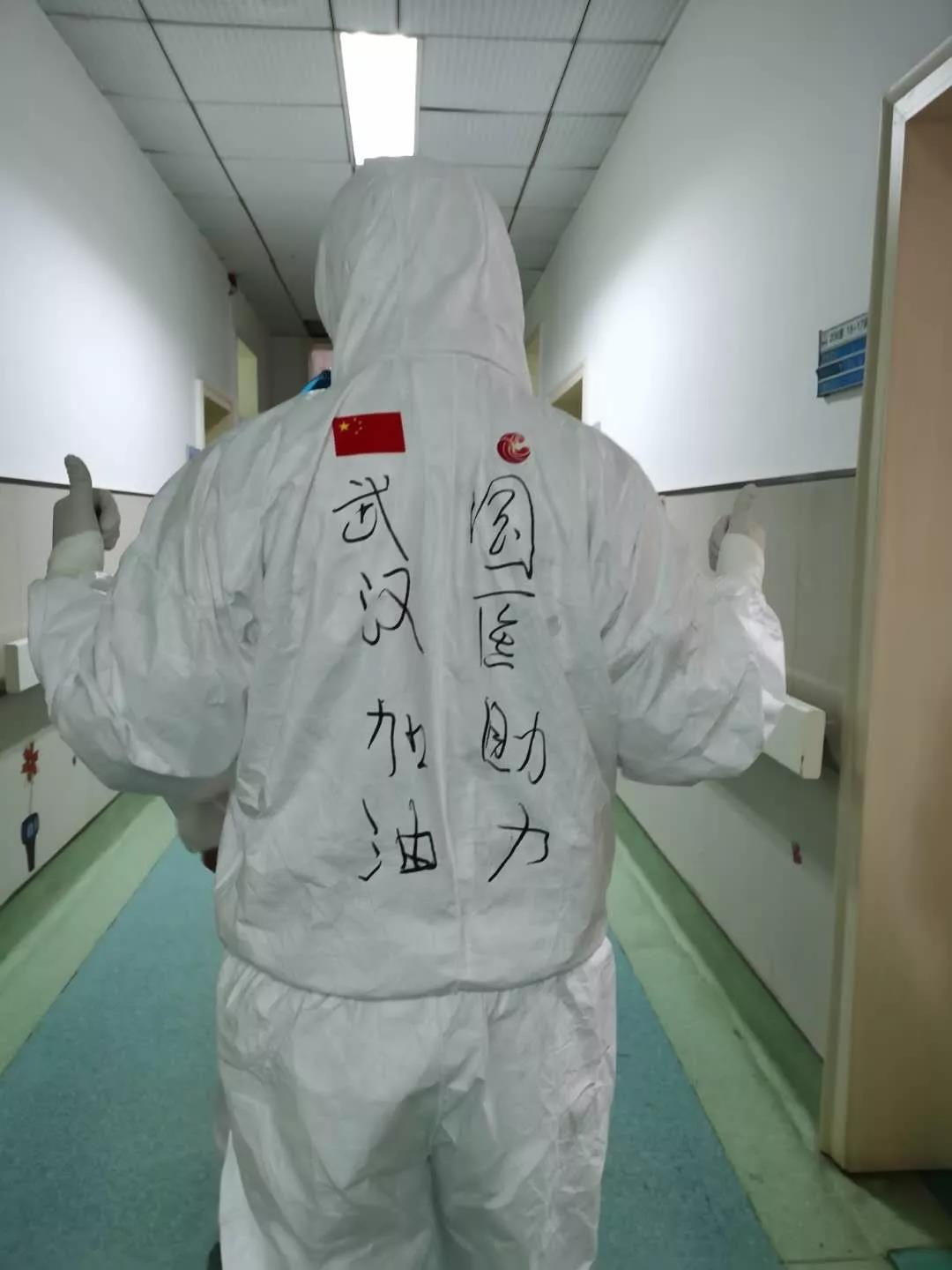培訓(xùn)后的隊(duì)員開始穿戴防護(hù)服,由于身著防護(hù)服,看不清彼此的面容,醫(yī)護(hù)人員在防護(hù)服上背后寫上自己的姓名,一個(gè)個(gè)化身暖心“大白”,彼此加油打氣,“武漢加油、國醫(yī)加油!”一字一句鼓舞人心,充滿力量。面對疫情和種種未知的風(fēng)險(xiǎn),西安國際醫(yī)學(xué)中心醫(yī)院醫(yī)療隊(duì)隊(duì)員主動(dòng)請纓,勇于上前,他們是最美逆行者!