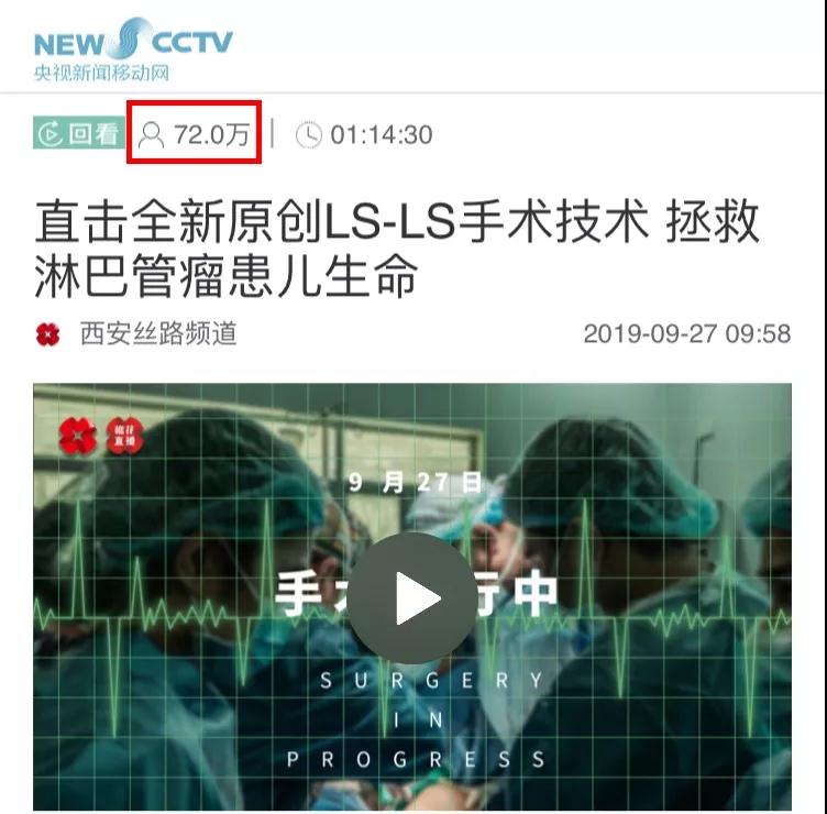 開診后的第一個手術(shù)日,西安電視臺全程直播了全新原創(chuàng)LS-LS手術(shù)技術(shù)拯救淋巴管瘤患兒生命的手術(shù)過程!央視新聞移動網(wǎng)、今日頭條客戶端、廣東廣播電視臺觸電新聞、西安網(wǎng)微博等同步播出西安國際醫(yī)學(xué)中心骨科醫(yī)院拯救淋巴管瘤患兒的全過程。據(jù)不完全統(tǒng)計,在線觀看直播達百萬,僅央視新聞移動網(wǎng)的觀看量達72萬!
