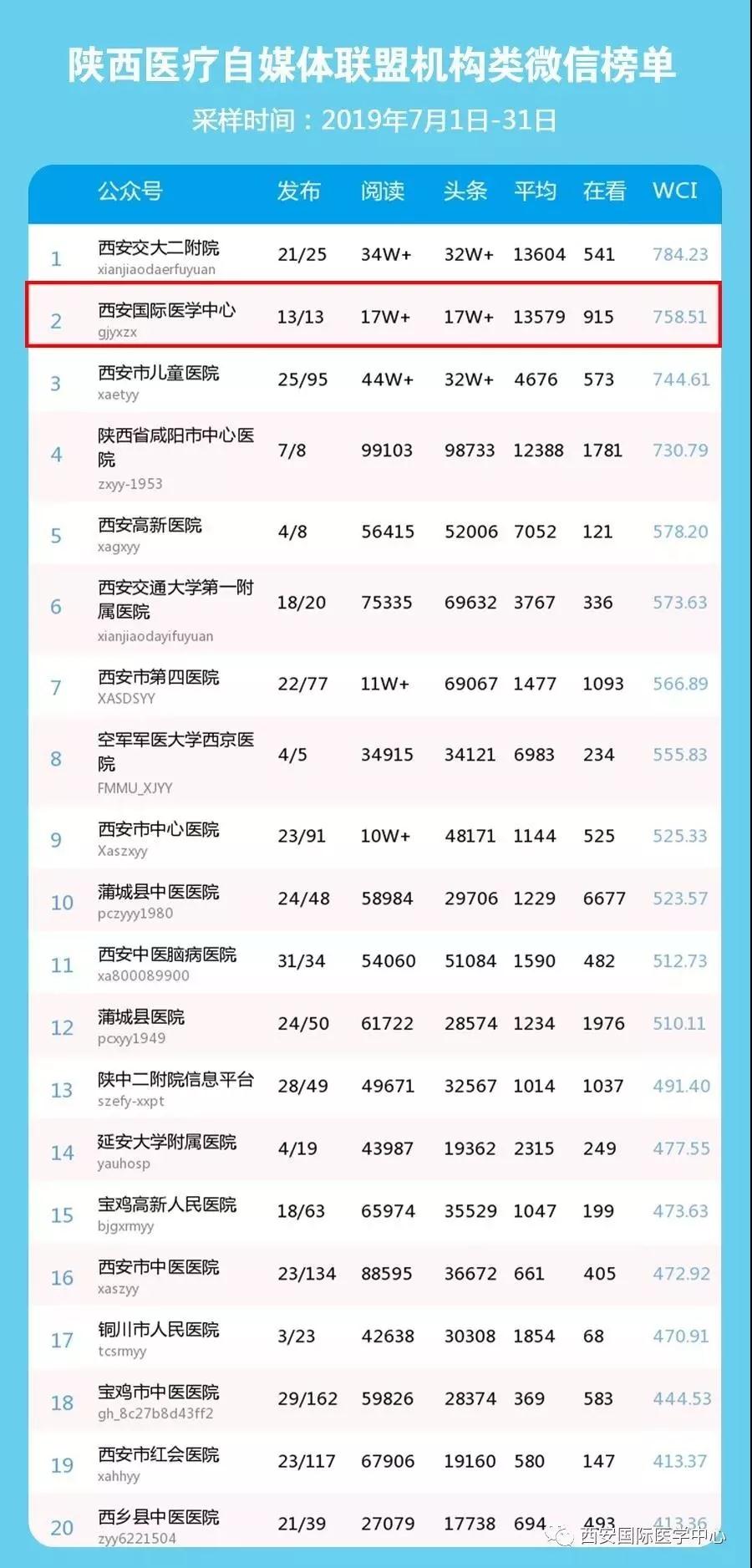 陜西醫(yī)療自媒體聯(lián)盟7月份機構(gòu)類微信榜單