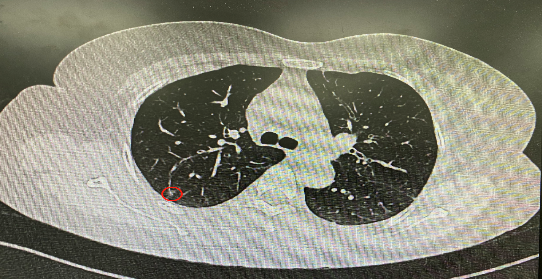 今年54歲的李女士(化名)7月初突然出現(xiàn)右上部腹痛,起初并未在意,以為稍作休息就會好轉(zhuǎn),但疼痛卻并未消退,持續(xù)了一個(gè)星期。李女士實(shí)在難以忍受,才在家人陪伴下來到西安國際醫(yī)學(xué)中心醫(yī)院就診。胸外科二病區(qū)崔凱主任接診患者后,詳細(xì)詢問病情并查閱檢查資料,經(jīng)胸部HRCT檢查,結(jié)果提示:右肺上葉后段混合密度結(jié)節(jié)影,考慮原位癌可能,即將患者收入胸腔外科二病區(qū)住院治療。