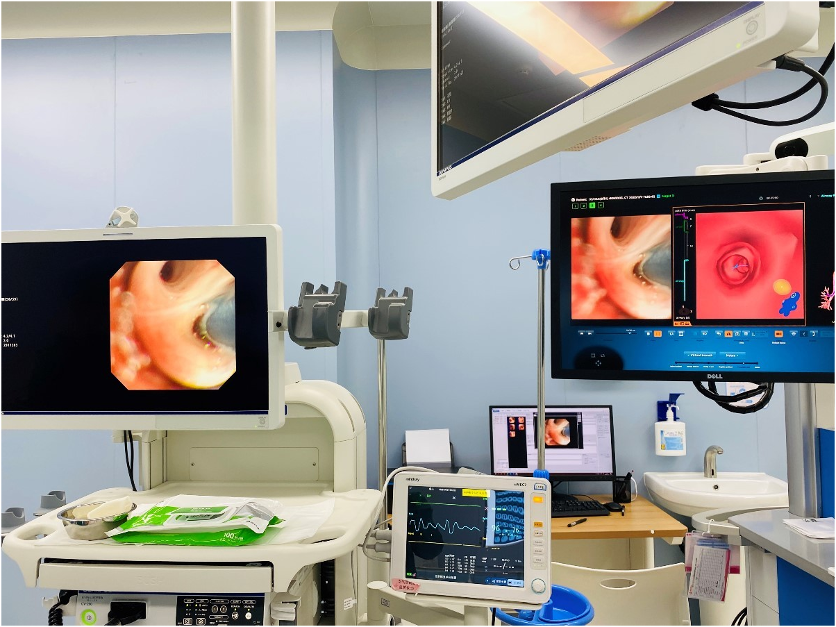 經(jīng)與患者家屬溝通,崔凱主任決定行外科手術(shù)治療。為達(dá)到精準(zhǔn)切除,術(shù)前需進(jìn)行肺小結(jié)節(jié)切除前定位。由于結(jié)節(jié)位于右肺上葉后段,傳統(tǒng)經(jīng)胸外穿刺術(shù)無法抵達(dá)病灶。崔凱主任與呼吸內(nèi)科一病區(qū)歐陽海峰主任討論后,決定擬行LungPro全肺診療導(dǎo)航下染色定位。即術(shù)前通過Lung Pro導(dǎo)航規(guī)劃染色位置,經(jīng)Lung Pro實(shí)時(shí)引導(dǎo)支氣管鏡抵達(dá)既定位置,注入亞甲藍(lán)染色劑標(biāo)記結(jié)節(jié)位置。
