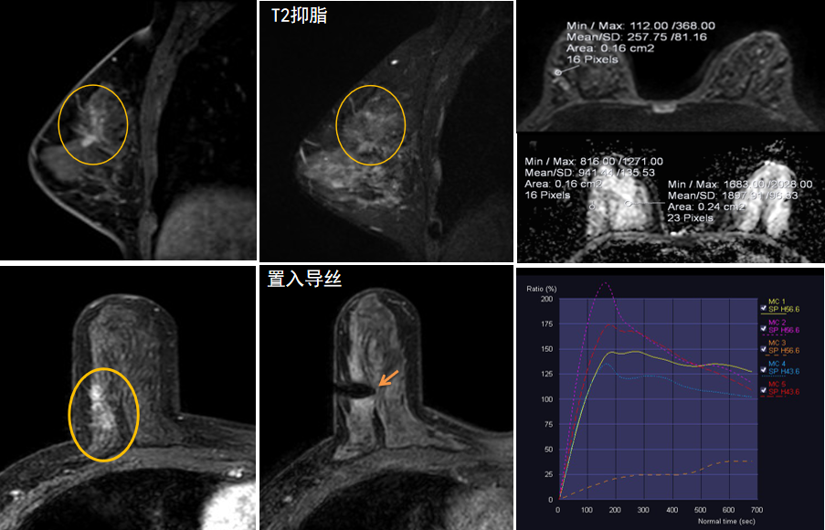 今年45歲的某女士,兩個(gè)月前行超聲檢查發(fā)現(xiàn)右乳結(jié)節(jié),乳腺X線攝影檢查提示右乳外上象限局部腺體結(jié)構(gòu)扭曲并簇狀無(wú)定形鈣化,為了進(jìn)一步評(píng)估病變性質(zhì)并確定范圍進(jìn)行了乳腺M(fèi)R平掃 DWI 增強(qiáng)的檢查,經(jīng)MR評(píng)估發(fā)現(xiàn)右乳病變范圍較廣,評(píng)估為BI-RADS 4類可疑病變,需要取得病理學(xué)結(jié)果。