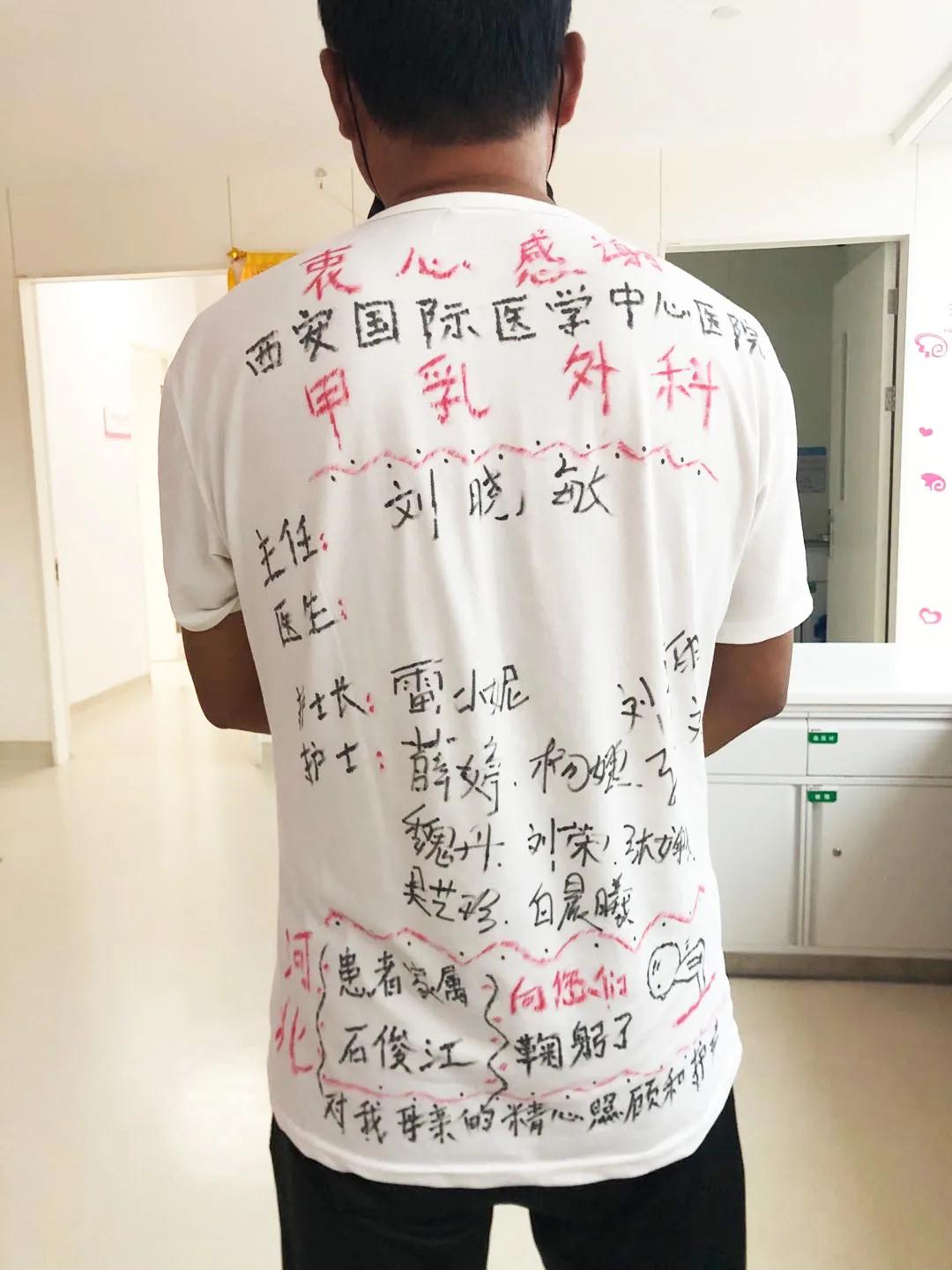 出院前一天,患者家屬想用一種特殊的方式記住醫(yī)生的恩情:“很感謝你們對我母親的照顧,你們在我這件襯衫上簽名,我開車?yán)浀臅r候就穿這件衣服,我走到哪里就念著你們到哪里,宣傳到哪里!我想讓更多人知道西安國際醫(yī)學(xué)中心這家醫(yī)院!這家醫(yī)院不僅就醫(yī)環(huán)境好,醫(yī)護人員的服務(wù)態(tài)度也很棒,我在這里就醫(yī),讓我感覺到前所未有的溫暖,我想讓那些同樣飽受病痛折磨的人早日得到身心解放,他們也能感受到溫暖。”