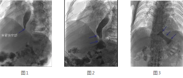 在韓國(guó)宏教授的帶領(lǐng)下,專家團(tuán)隊(duì)經(jīng)多方面評(píng)估后,決定在DSA下為劉大爺行食管造影 食管支架置入術(shù)。術(shù)中透視可見(jiàn)食管中上段擴(kuò)張明顯,食管下端賁門口明顯狹窄,造影劑淤積,呈線性緩慢進(jìn)入胃腔(見(jiàn)圖1),經(jīng)過(guò)準(zhǔn)確定位后,釋放食管支架,再次造影可見(jiàn)造影劑經(jīng)支架順利進(jìn)入胃腔(見(jiàn)圖2)。2天后再次造影見(jiàn)食管支架完全打開(kāi),位置正常,造影劑可順利通過(guò)支架(見(jiàn)圖3)。