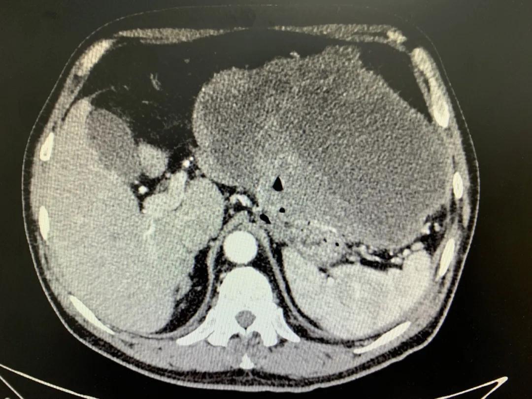 患者入院時(shí)血紅蛋白數(shù)值仍持續(xù)下降,出現(xiàn)失血性休克表現(xiàn),危及生命。消化外科二病區(qū)蔡磊主任接診后,組織科室迅速對(duì)患者進(jìn)行了全面的檢查。CT提示腫瘤大小約19.3*10.3cm,腫瘤內(nèi)提示大量積血。結(jié)合相關(guān)檢查,考慮為罕見的巨大胃間質(zhì)瘤合并出血。