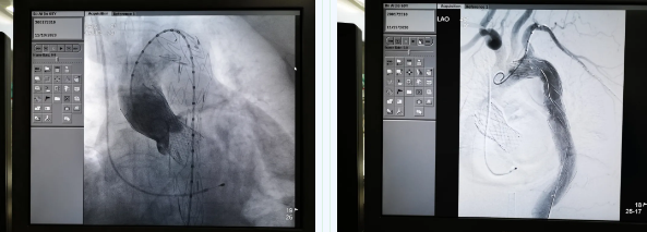 張金洲副院長關注著手術的每一個細節,從建立軌道、跨瓣、釋放瓣膜、支架定位、造影和食道超聲確認,每一步都緊張而有序地進行著。為了最大程度保障病人安全,心臟外科程亮副主任也帶隊建立動靜脈入路,以備緊急體外循環。經過團隊每一位成員的密切配合,在近四小時的緊張奮戰之后,“TAVR TEVAR”復合手術順利完成;經過造影和食道超聲證實:人工主動脈瓣無返流無瓣周漏、冠脈顯影良好,主動脈覆膜支架無內漏無移位。