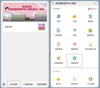 為方便患者進(jìn)行核酸檢查,我院開通核酸檢測網(wǎng)上預(yù)約,并免掛號(hào)費(fèi)用,患者可通過西安國際醫(yī)學(xué)中心醫(yī)院服務(wù)號(hào)進(jìn)行預(yù)約和自助繳費(fèi)。