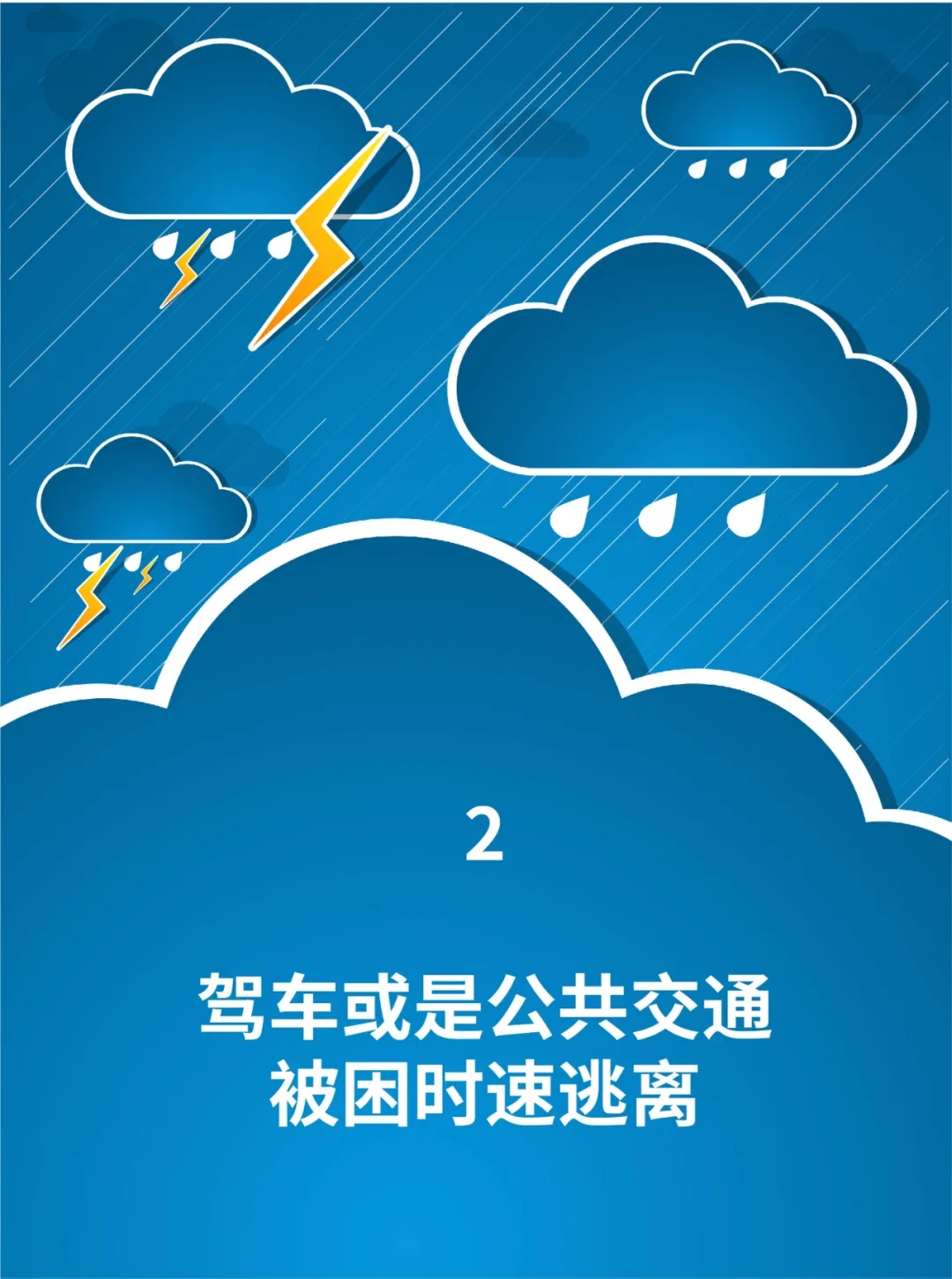 地鐵站、地下停車場、地下通道、下坡、下沉式立交橋下等低洼地段以及有橋梁、有漩渦的地方很危險。遠離老舊建筑、電線桿、廣告牌、路燈。遠離高壓線、高壓電塔、變電器,電閘、配電箱等電力設(shè)施及有供電危險標(biāo)志的一切物品。
