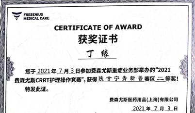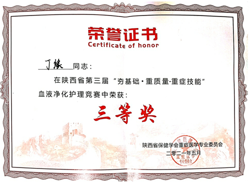 2021年5月,陜西省保健學(xué)會重癥醫(yī)學(xué)專業(yè)委員會舉辦了第三屆《“夯基礎(chǔ)?重質(zhì)量-重癥技能”血液凈化護理技能競賽》。丁緣經(jīng)過激烈角逐,從陜西省21家醫(yī)院的24名選手中脫穎而出,榮獲三等獎,拿到了全國聯(lián)賽的入場券。