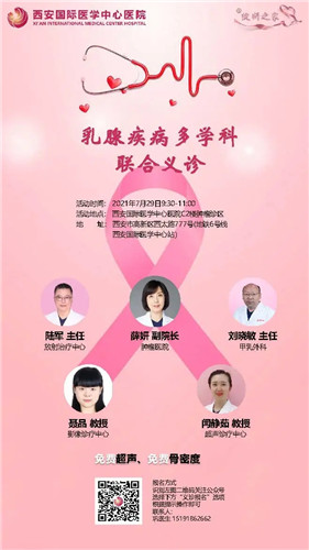 為方便患者就醫(yī),提高群眾乳腺健康意識(shí),由西安國(guó)際醫(yī)學(xué)中心醫(yī)院腫瘤醫(yī)院、甲乳外科、放射治療中心、影像診療中心、超聲診療中心多位知名專家組成團(tuán)隊(duì),為廣大乳腺疾病患者提供全面、專業(yè)及個(gè)體化診療,并提供免費(fèi)乳腺超聲和骨密度檢查,歡迎掃碼報(bào)名。