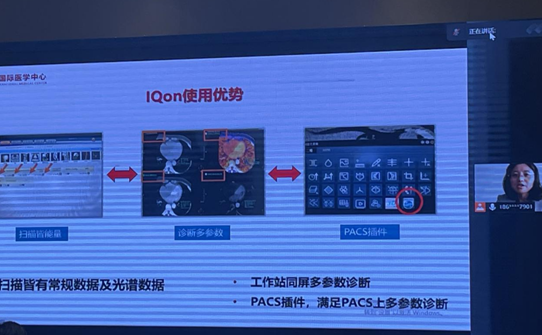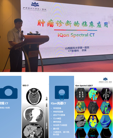 授牌儀式后即開始精彩的學術講座,首先,山西醫科大學第一醫院影像科喬英教授分享了“IQon光譜CT在腫瘤診斷的臨床應用”。喬教授指出IQon Spectral CT的光譜重建可以提供多參數數據,如單能級圖像、無水碘圖、有效原子序數值等,更加清晰的觀察病灶范圍,更加精準的發現小病灶、進行腫瘤分期及術后療效評估。