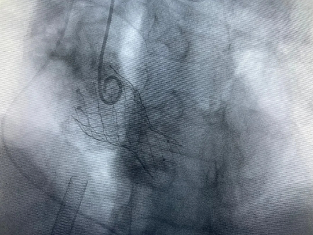結(jié)合老人病情特點(diǎn):年齡高、室壁厚、左室腔小、瓣膜鈣化嚴(yán)重,術(shù)中球囊擴(kuò)張和瓣膜釋放過(guò)程有循環(huán)崩潰可能;為降低此種風(fēng)險(xiǎn)、最大程度提高手術(shù)成功率,張金洲副院長(zhǎng)在術(shù)前組織了由楊金保博士帶領(lǐng)的TAVR團(tuán)隊(duì)多次反復(fù)溝通、討論,制定了各種應(yīng)急處理方案。最終經(jīng)過(guò)TAVR團(tuán)隊(duì)的默契配合,手術(shù)歷時(shí)2小時(shí),用20#球囊預(yù)擴(kuò)張后順利植入23#主動(dòng)脈瓣生物瓣膜,再次后擴(kuò)后主動(dòng)脈根部造影顯示:人工主動(dòng)脈瓣生物瓣位置良好,瓣葉開(kāi)閉正常;冠脈顯影良好。經(jīng)食道超聲顯示:主動(dòng)脈瓣葉活動(dòng)度良好,主動(dòng)脈跨瓣壓差約35mmHg,未見(jiàn)瓣周漏及明顯返流。出手術(shù)室前老人便已蘇醒,自訴憋悶癥狀完全消失。