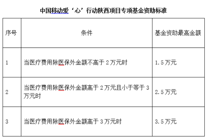 (三)項目實行“屬地醫(yī)保 慈善捐助 合作醫(yī)院減免”三結合的全額資助模式,受助患兒應在合作醫(yī)院首先進行醫(yī)保結算;醫(yī)保結算剩余部分,由中國移動愛‘心’行動專項基金按最高限價標準進行結算,其余超出治療費用由合作醫(yī)院減免,同一救助對象1年內只給予一次救助。