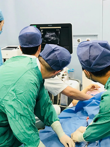 為了更好的服務(wù)患者,確保每一位患者都能得到最適合自己的治療方案,心臟外科二病區(qū)程亮主任團(tuán)隊(duì)聯(lián)合超聲診療中心韓增輝副主任團(tuán)隊(duì),于8月2日為一位75歲老人在超聲引導(dǎo)下順利完成下行腔靜脈濾器置入術(shù)。患者取平臥位,右髖外旋,右膝略屈,右側(cè)腹股溝常規(guī)消毒鋪巾,2%利多卡因5ml局部麻醉,右側(cè)股靜脈穿刺,置入導(dǎo)絲,確認(rèn)導(dǎo)絲進(jìn)入下腔靜脈,順導(dǎo)絲置入鞘管,拔出導(dǎo)絲,確認(rèn)鞘管頂端位于腎靜脈水平以下、匯合部以上的下腔靜脈腔內(nèi),以頂桿推入濾器至鞘管頂端,超聲定位,釋放濾器,超聲觀察:濾器打開順利,位置正常,形態(tài)良好,彩色血流示:顯示濾器內(nèi)血流通暢。