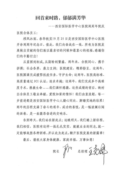 今天,醫院舉行了主題為“風雨兼程兩周年 砥礪前行譜新篇”簡樸慶祝活動。國際醫學集團實際控制人劉建申、西安國際醫學中心醫院總經理王志峰、副院長李武平、楊峰、張斌等領導與全體員工歡聚一堂,共同慶祝醫院開診兩周年。