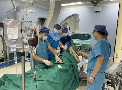 2021年8月16日21:30,消化內(nèi)科五病區(qū)接呼吸科會(huì)診,無誘因反復(fù)黑便10年的黨叔,因嘔血便血發(fā)生失血性休克,希望科室能通過介入手術(shù)快速找到病人出血原因并止血。時(shí)間就是生命,李瑞軍主任毫不猶豫從家趕來,帶著住院總李冰醫(yī)生,把所有能想到的可能引起病人出血的腹腔內(nèi)血管找了個(gè)遍,雖然沒有找到確切誘發(fā)出血的血管,但發(fā)現(xiàn)內(nèi)臟多發(fā)動(dòng)靜脈血管畸形。凌晨5點(diǎn),李主任多次電聯(lián)韓院長(zhǎng),反復(fù)討論患者病情,決定先栓塞部分血管。可是返回病房不到一小時(shí),病人再發(fā)黑便,血壓掉到70/30mmHg,心率130-160次/分,血氧飽和度測(cè)不出,為預(yù)防窒息,急行氣管插管輔助通氣治療!