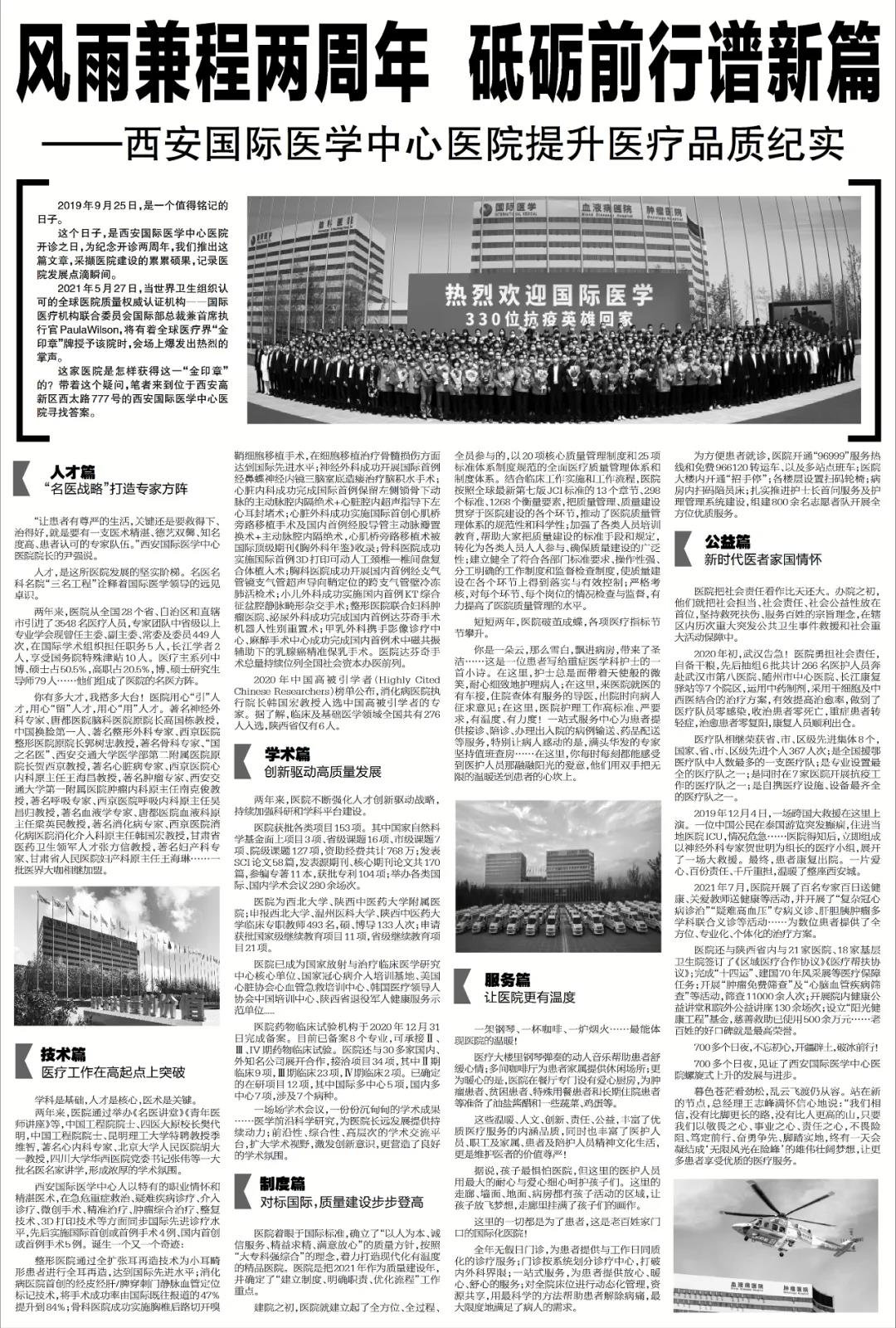 今日《華商報》A8版用整版的篇幅刊登了《風(fēng)雨兼程兩周年 砥礪前行譜新篇——西安國際醫(yī)學(xué)中心醫(yī)院提升醫(yī)療品質(zhì)紀(jì)實(shí)》。華商報以圖文并茂的形式記錄了醫(yī)院建設(shè)的點(diǎn)滴瞬間,全方位、多角度報道了醫(yī)院兩年來的發(fā)展碩果。