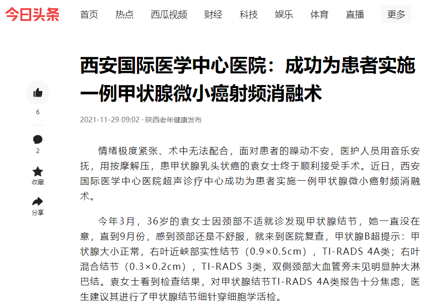 西安國(guó)際醫(yī)學(xué)中心醫(yī)院:成功為患者實(shí)施一例甲狀腺微小癌射頻消融術(shù)