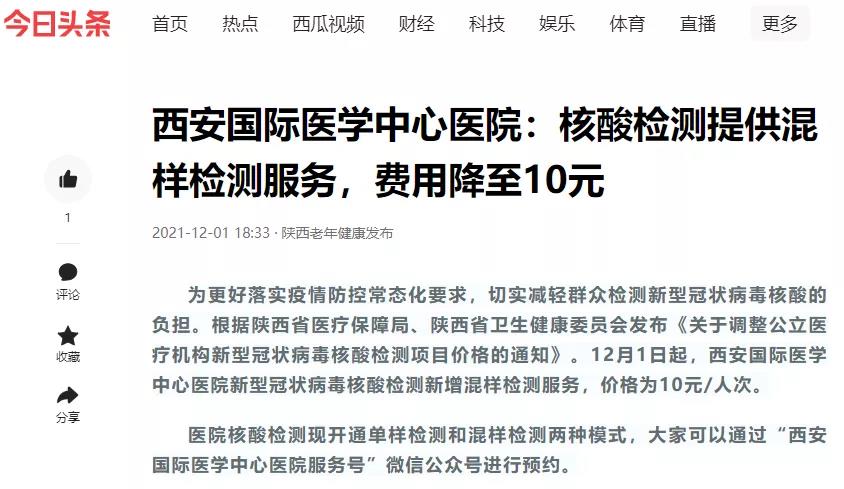 西安國(guó)際醫(yī)學(xué)中心醫(yī)院:核酸檢測(cè)提供混樣檢測(cè)服務(wù),費(fèi)用降至10元