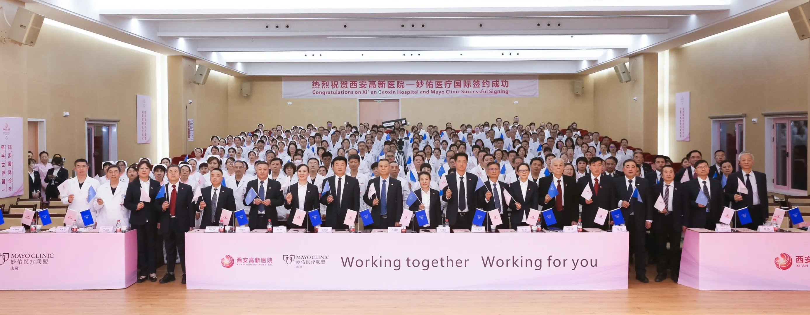 儀式上,妙佑醫療國際(Mayo Clinic)醫療執行總監思迪絲?瑞扎與西安國際醫學中心醫院院長尹強、西安高新醫院院長宋瑛共同簽署合作協議,并將聯盟醫院水晶杯授予兩家醫院。
