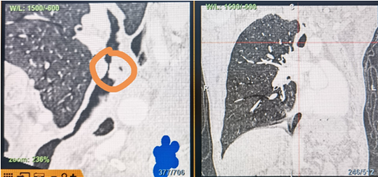 時間就是生命!了解患者病情后,歐陽海峰立刻啟動氣道梗阻緊急救治通道,協(xié)調(diào)院前轉(zhuǎn)運,急診快速入院流程。凌晨患者入院胸部CT顯示,現(xiàn)存唯一的呼吸通道在右主支氣管處,狹窄處僅約3毫米,患者命懸一線!