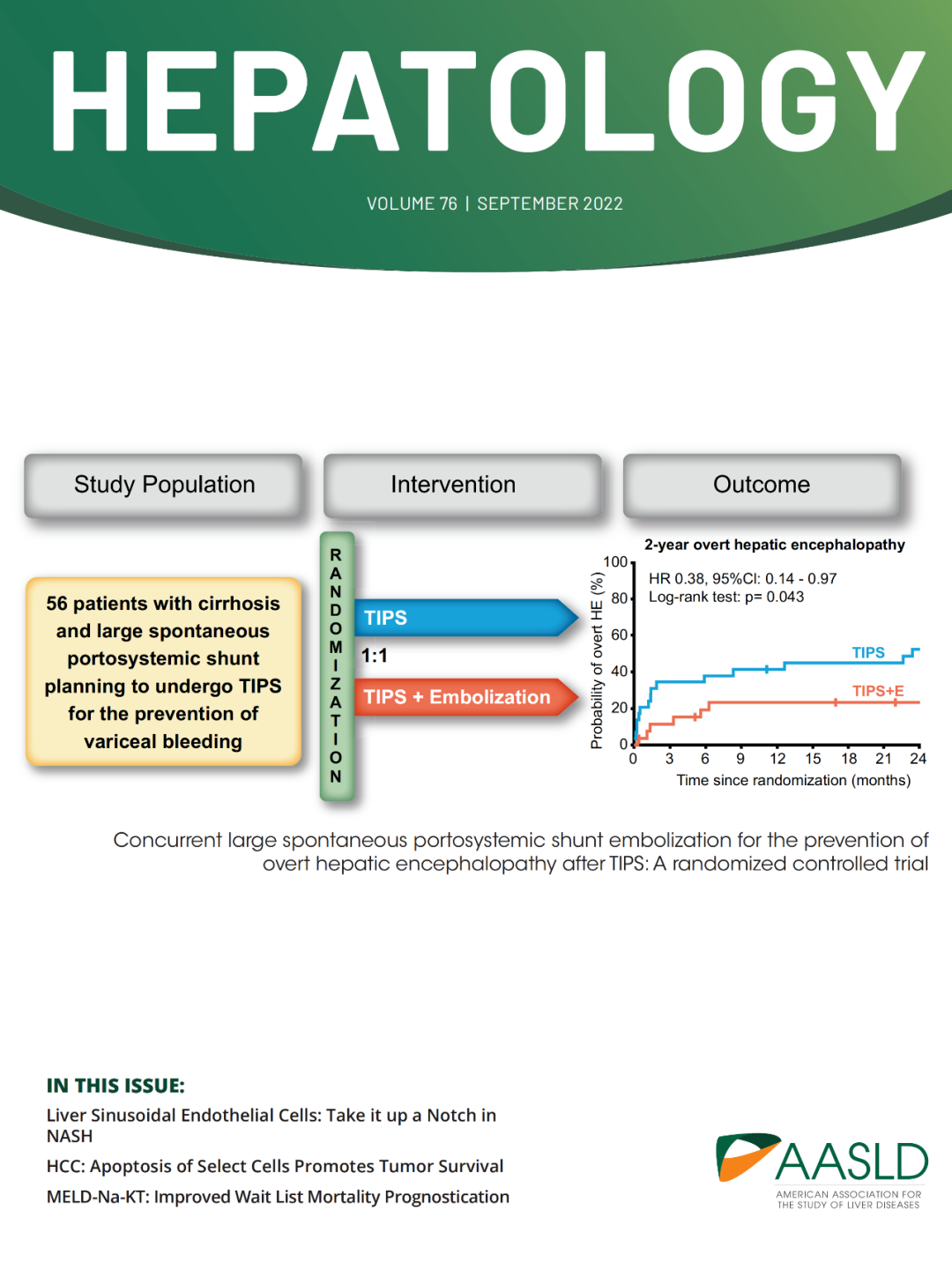 新近,西安國際醫(yī)學(xué)中心醫(yī)院消化病醫(yī)院韓國宏教授團(tuán)隊(duì)的一項(xiàng)隨機(jī)對(duì)照試驗(yàn)“經(jīng)頸靜脈肝內(nèi)門體靜脈分流術(shù)(TIPS)聯(lián)合自發(fā)性門體分流封堵預(yù)防術(shù)后顯性肝性腦病”的論著被最新一期的Hepatology雜志(IF=17.29,JCR:Q1)遴選為9月份封面文章(圖1)。該研究顯示TIPS聯(lián)合粗大分流道封堵能夠有效降低TIPS術(shù)后顯性肝性腦病的發(fā)生率,且不增加門靜脈高壓、分流道功能障礙和其他不良事件的并發(fā)癥風(fēng)險(xiǎn)[1]。