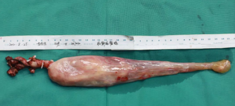 手術(shù)刀游走在人體血管的江河湖海,在完全游離肝臟顯露全段下腔靜脈后,依次有序阻閉“主干道”的血流供應(yīng),最后阻斷肝臟血供,于肝臟尾狀葉肝短靜脈下方切開(kāi)下腔靜脈,借助經(jīng)食管超聲實(shí)時(shí)嚴(yán)密的監(jiān)控,經(jīng)下腔靜脈切口順利取出位于右心房、膈上下腔靜脈、肝后下腔靜脈內(nèi)的瘤栓,隨即阻閉膈下腔靜脈,同時(shí)恢復(fù)肝臟血流“通航”。手術(shù)刀繼續(xù)向下行進(jìn),一點(diǎn)一點(diǎn)地剝離下腔靜脈遠(yuǎn)心段直至右側(cè)髂總靜脈、右側(cè)髂內(nèi)靜脈內(nèi)的瘤栓,最終,一根長(zhǎng)達(dá)35cm、最寬直徑5cm的腔靜脈瘤栓被完整取出!
