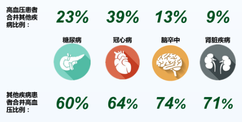 有圖有真相:在高血壓患者中,合并糖尿病的占23%,合并冠心病的占39%,合并腦卒中的占13%,合并腎臟疾病的占9%。而在糖尿病、冠心病、腦卒中、腎臟疾病患者中,合并高血壓的患者分別占了60%、64%、74%和71%。高血壓和上述4個合并癥之間呈現(xiàn)你中有我,我中有你的關系。