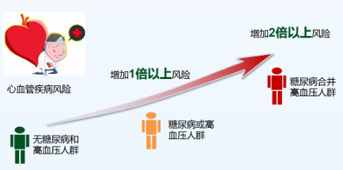 和無糖尿病、高血壓的人群相比,患糖尿病或高血壓能使心血管疾病風險增加1倍以上,同時患糖尿病和高血壓的患者,心血管疾病風險增加2倍以上。
