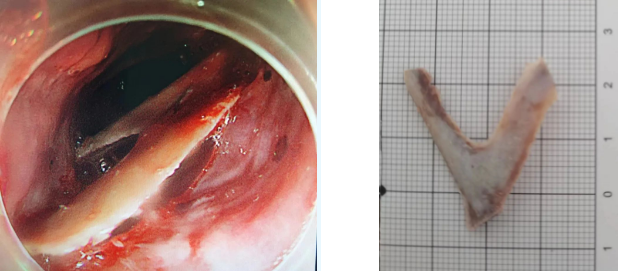 上午11時,在麻醉手術中心的全力配合下,張惠林醫(yī)生操作內鏡,可見異物完全坎頓到食管壁內,黏膜完全覆蓋異物,經(jīng)多次調整角度及牽拉方向,用時10分鐘,將骨頭安全取出。從入院后到異物取出用時僅1小時。