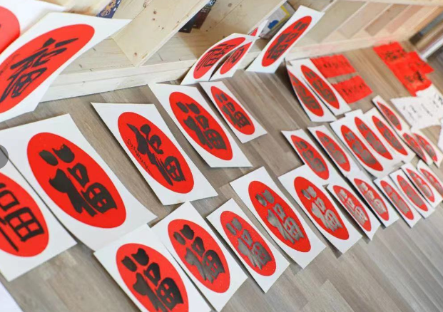 “厚德載物”、“寧?kù)o致遠(yuǎn)”、“天高海闊”......一張張燙金的紅紙散發(fā)著墨香,一個(gè)個(gè)“福”字在楷體、行書(shū)、草書(shū)間自由切換,書(shū)法蒼勁有力、磅礴大氣,在紅色的襯托下更顯喜慶祥和。