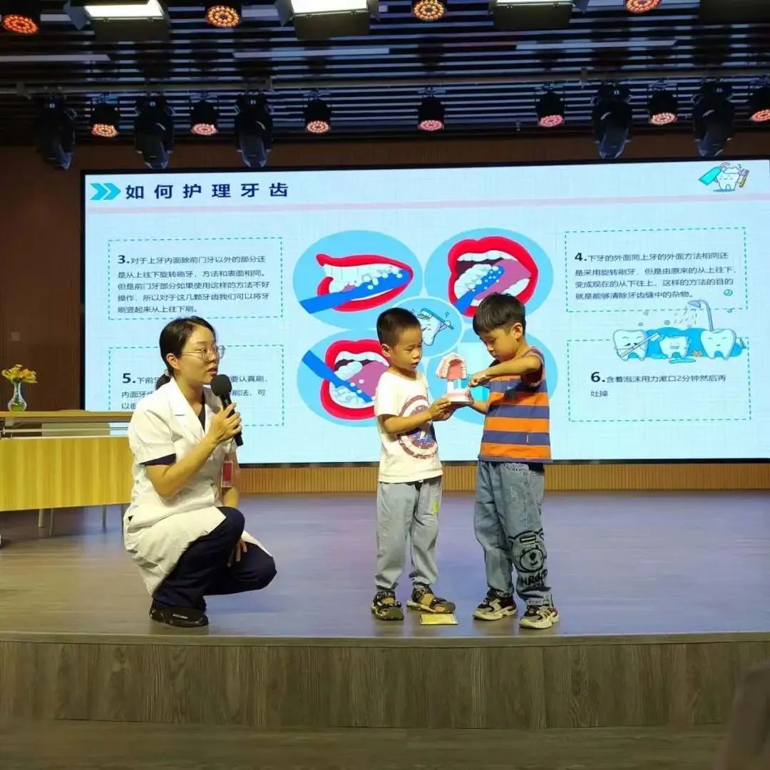 孩子們?cè)谂_(tái)下認(rèn)真聽(tīng)講,舉手發(fā)言,在輕松愉悅的氛圍中懂得怎樣愛(ài)牙護(hù)牙。