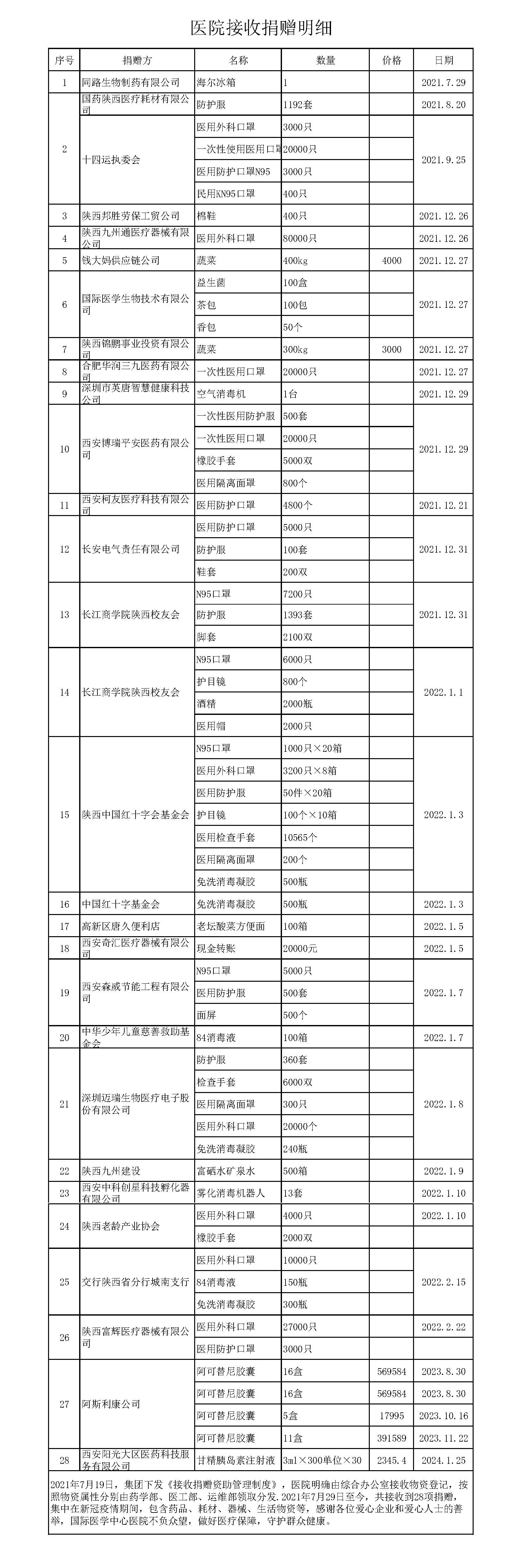 疫情期間接收物資主要有食品類、服飾類、清潔用品類、消毒用品等,物資主要有;方便面、礦泉水、84消毒液、慕斯軟墊、鞋子、拉拉褲、醫(yī)用垃圾袋、15L垃圾桶、等。捐贈物資均是通過庫房管理員簽字接收直接入庫管理,領取方式:經(jīng)各部門領導同意后按要求發(fā)放,統(tǒng)一制定發(fā)放模版,部門(領用人)簽字,領用流程結束。庫房管理員將所有物資發(fā)放明細同步按類別歸檔保存。