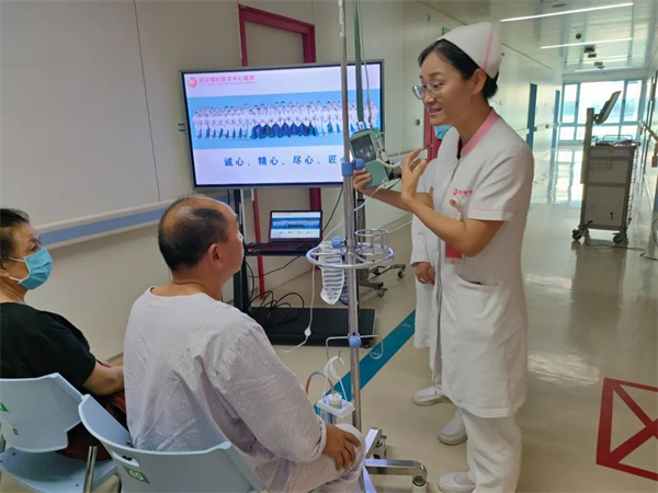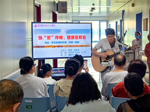 宣教會現(xiàn)場還充滿了溫暖的音符。崔智杰護士巧妙地將音樂療愈融入護理關懷,為在場患者深情彈唱了《隱形的翅膀》和《月亮代表我的心》。他表示:“醫(yī)護人員和家屬的心愿是一樣的,都期盼患者早日康復。希望音樂的感染力能為他們增添戰(zhàn)勝病魔的力量。”歌聲不僅傳遞了關懷,也進一步拉近了護患距離,增強了患者積極面對疾病的心理建設。