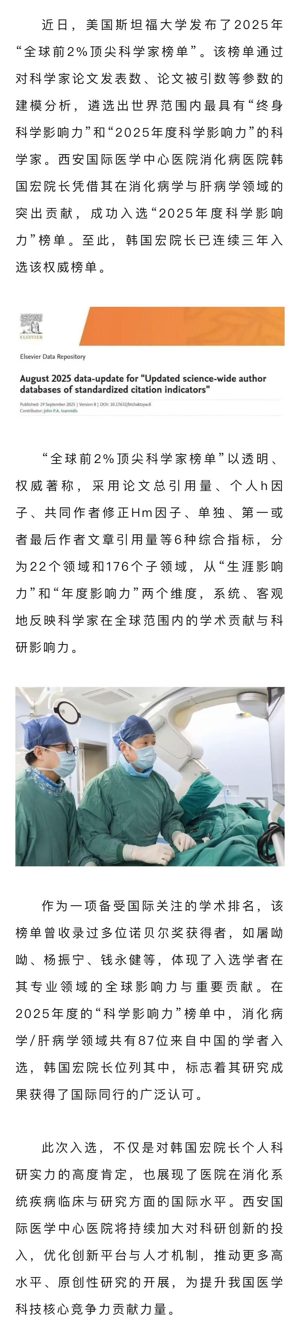消化病醫院韓國宏院長入選2025年“全球前2%頂尖科學家榜單”